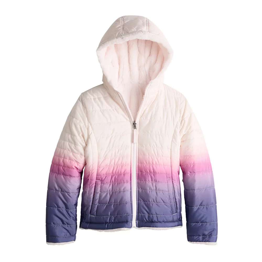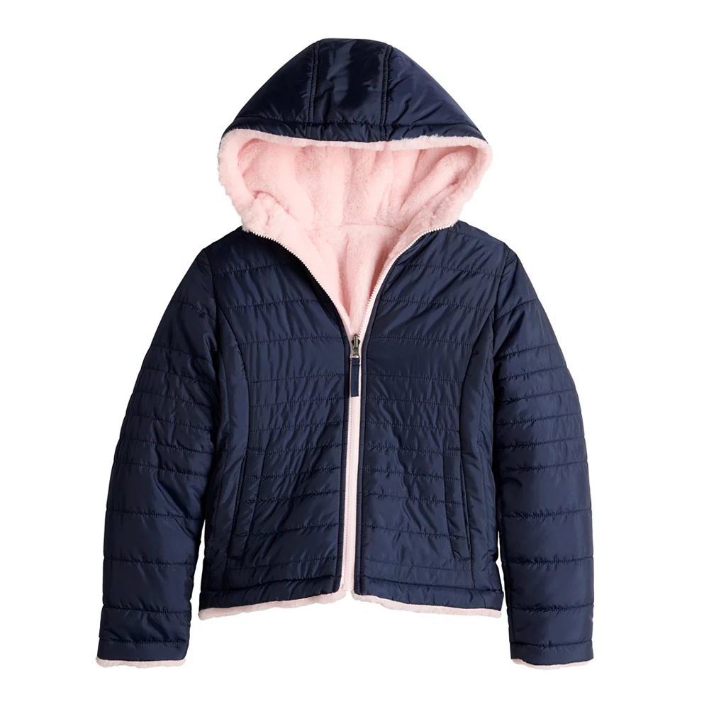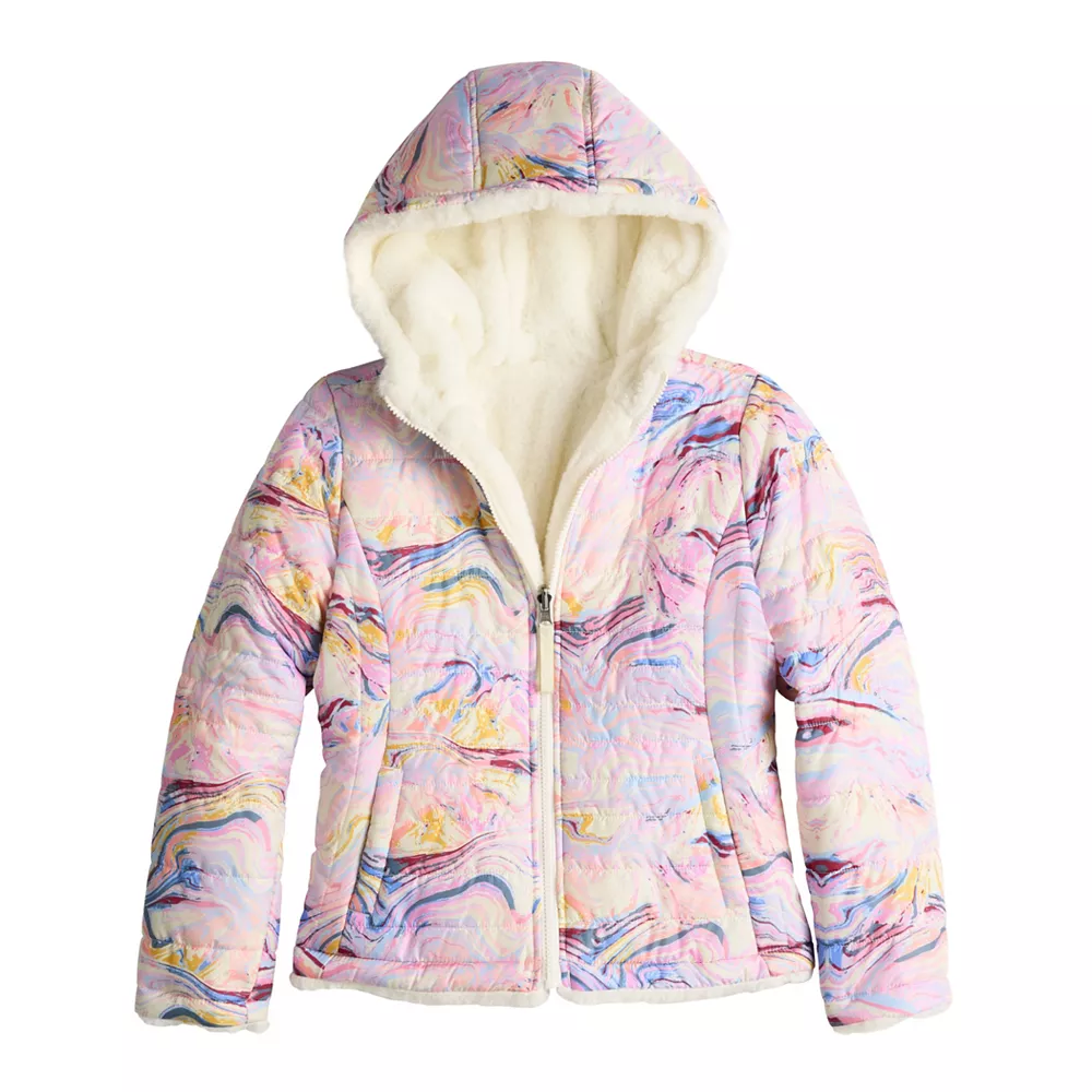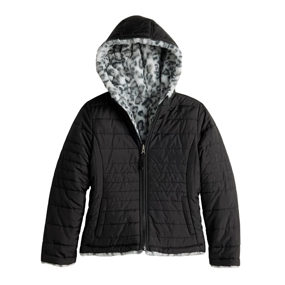 A reversible design gives this girls’ SO jacket versatile stle, while a faux-fur shell makes it a cozy choice for cooler days.
