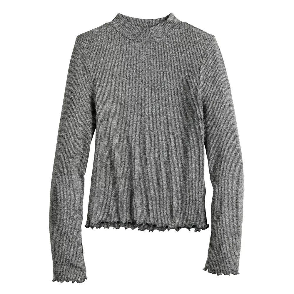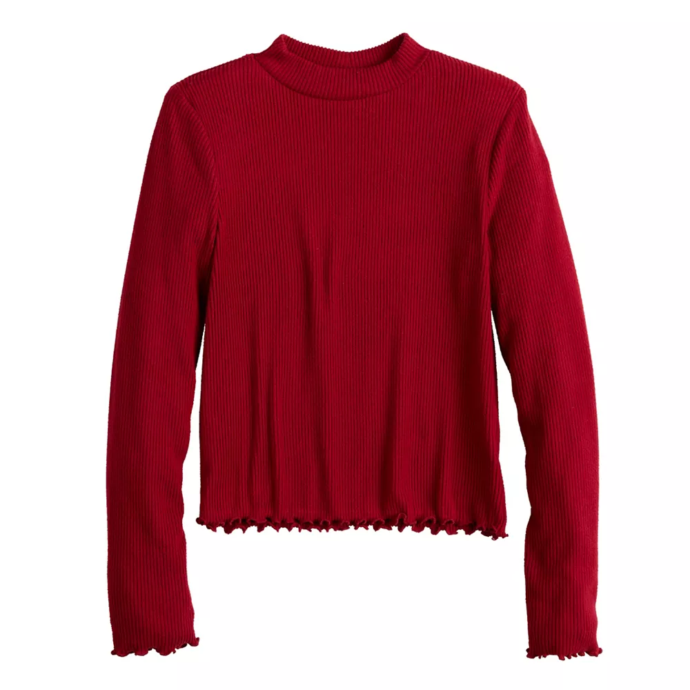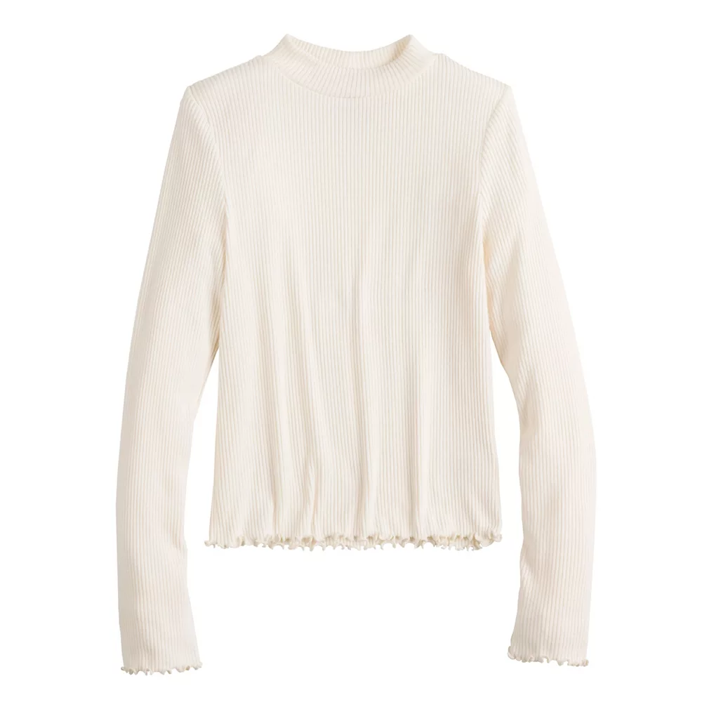 An eye-catching lettuce-edge hem and sophisticated mockneck design make this SO tee the perfect choice for your growing girl.