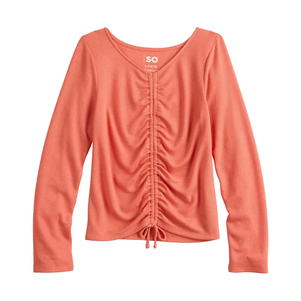 Add a touch of wow factor to her everyday wardrobe with this girls’ cinch front tee from SO.