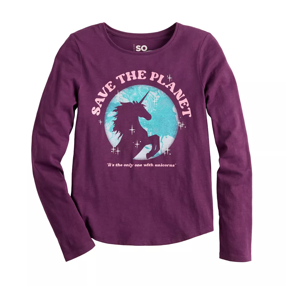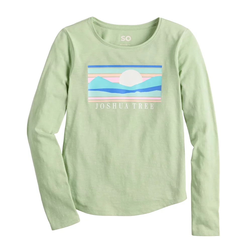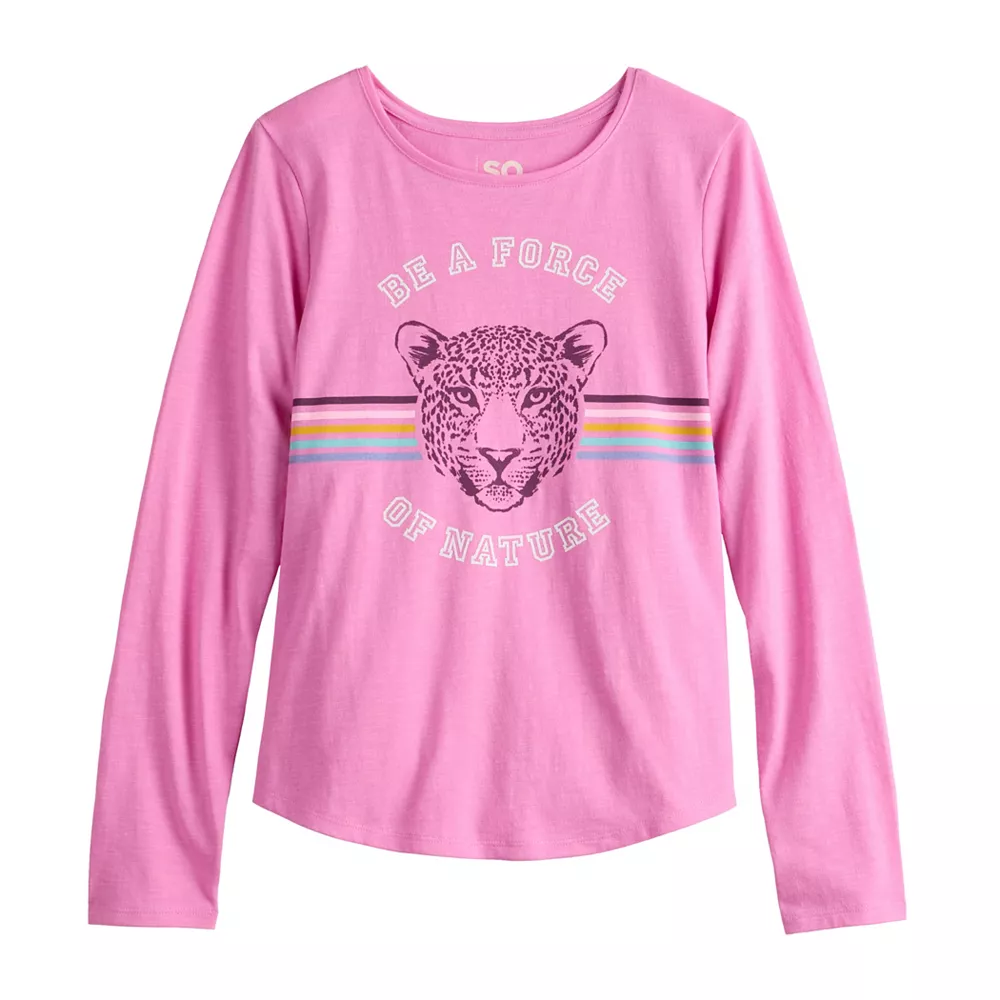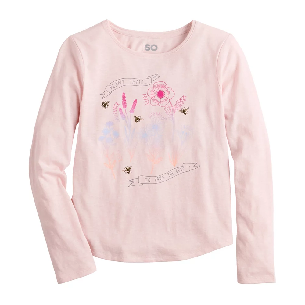 SO defines modern style with this girls’ long-sleeved graphic tee.