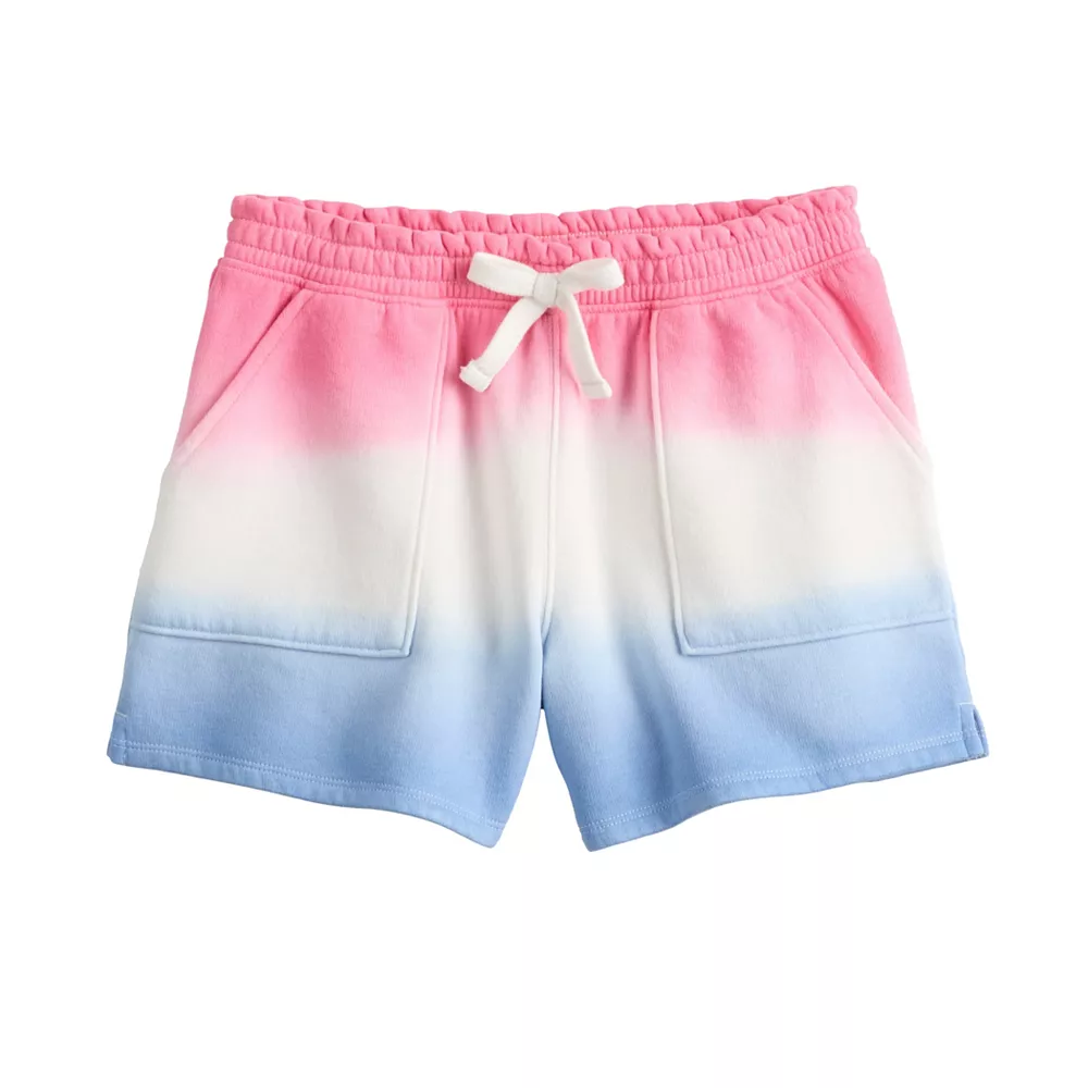 Patriotic pride and trendy style abound on these girls’ red, white and blue tie dye paperbag shorts from SO.