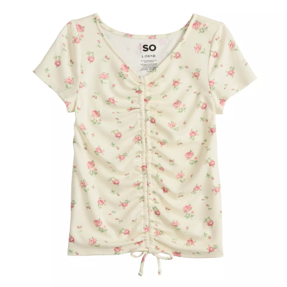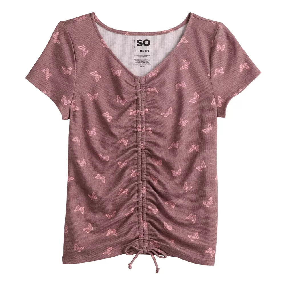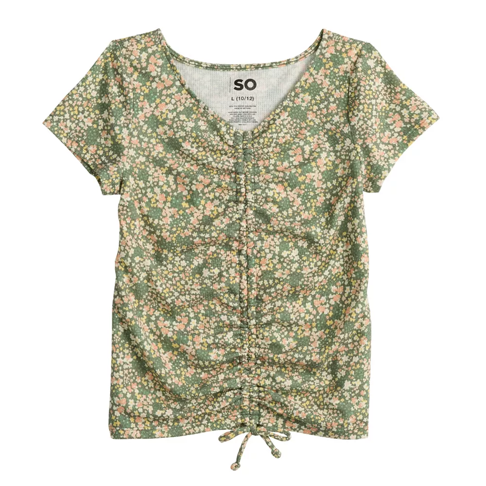 She’ll love her look in this girls’ cinch front V-neck tee from SO.