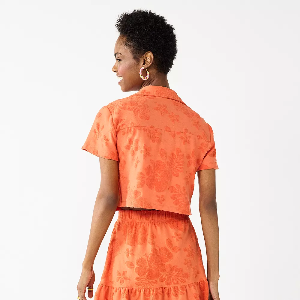 Arrive in style and flair when you rock this juniors’ cropped button front shirt from SO. Pair it with the matching skirt and cropped tank for a cute, put-together look.
